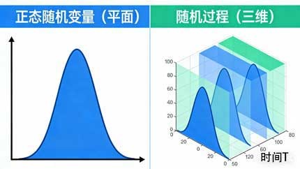 从图上看,单个随机变量用一个二维平面表示,单个变量的随机过程需要三维平面表示。在每个时间t,它就是一个随机变量。